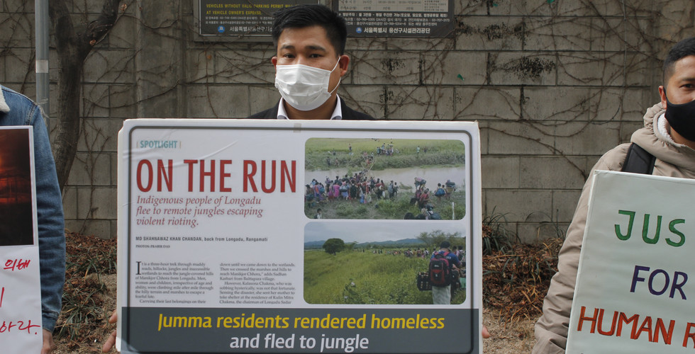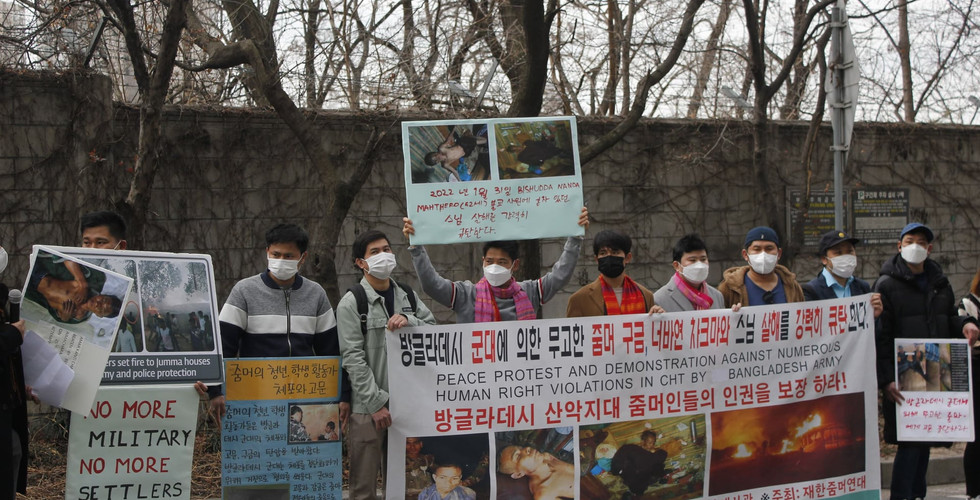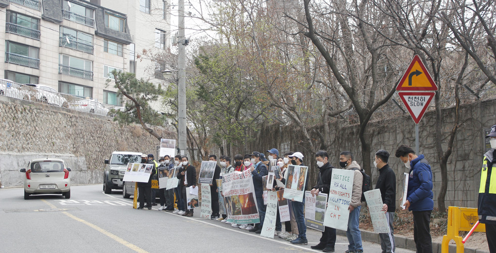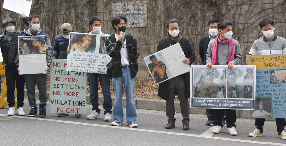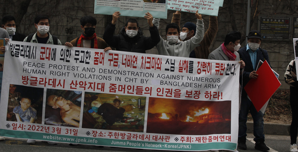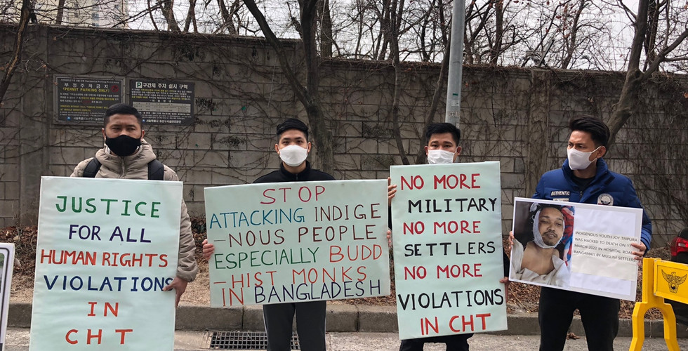 On behalf of Jummo Peoples Network (JPNK) today 31/03/22 we have arranged a peace protest and demonstrations in Seoul, at in front of the Bangladesh Embassy against various human rights violations in Chittagong Hill Tracts (CHT) Bangladesh. Our speakers nicely explained the current scenario of CHT. According to CHT commission there are more than 30 human right violations itself in the current year occurred by security forces and Bengali settlers. Out of these 9 JUMMO houses burnt into ashes, 25 indigenous jummos arrested, 4 people tortured and killed , 15 Jummos were abducted and ransom has been collected. It has been observed that law and order situation in CHT. deteriorating day by day. Crimes against indigenous women such as rape, torture, physical harassment, love jihad etc. are taking place continuously. It has been more than 24 years CHT accord has been signed but no sign of peace and harmony in CHT region. Moreover, ruling party of Bangladesh Awami League has been in power for more than 13 years. So it is quite evidence that Bangladesh government have no proper intentions to implement CHT accord. Our demands and goals can not be suppressed by killing Jummos, murder, rape, land grabbing etc. We strongly support our Jummo activists and leaders who have been working hard enough for our fair rights and demand. There struggle will not go in vain. Our aim and demands